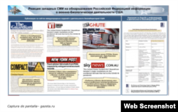 El Ministerio de Defensa de Rusia anunció que después de que ellos hayan “descubierto la actividad de los biolaboratorios en Ucrania”, los medios de comunicación mundiales comenzaron a prestar atención a las labores del ejército estadounidense en el campo del desarrollo de armas biológicas contra Rusia. En particular, durante su informe, el teniente general Igor Kirilov mencionó la publicación de The Guardian titulada “Dangerous lab leaks happen far more often than the public is aware”, la de Compact, que se titula “How “Biodefense” Mercenaries Endanger Us” y la de New York Post denominada “Fauci adviser hid emails з FOIA requests by using personal account: records”. Aunque algunos de estos artículos abordan el tema de posibles filtraciones de laboratorios biológicos, ninguno de ellos expone la conexión de los biolaboratorios estadounidenses con Ucrania y el desarrollo de armas biológicas contra Rusia. También en la diapositiva se pueden ver publicaciones de páginas de propaganda tan infames como VT RADIO: Uncensored Alternative Foreign Policy Talk y BitChute, que han difundido repetidamente varias teorías de conspiración y narraciones del Kremlin sobre Ucrania.